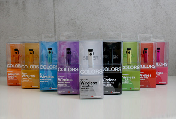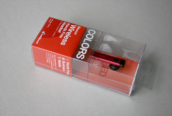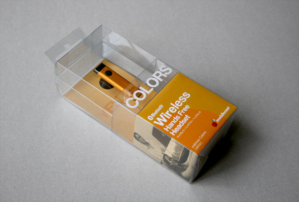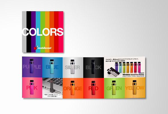 ワイヤレステクノロジーを利用した製品を開発、販売するモバイルキャストのハンズフリー製品「COLORS」のリーフレット、パッケージデザインを開発。ビジネス目的ではないカジュアルに使えるアイテムとして、シンプルに9色のカラーバリエーションを訴求したデザインとした。