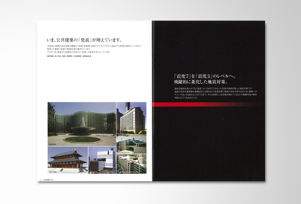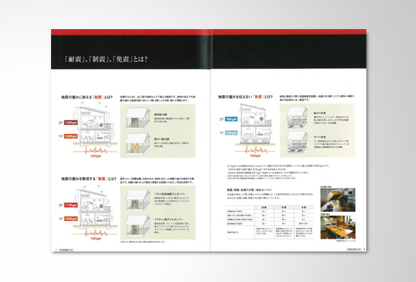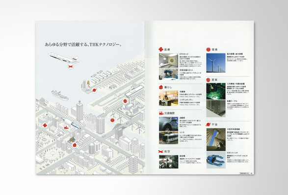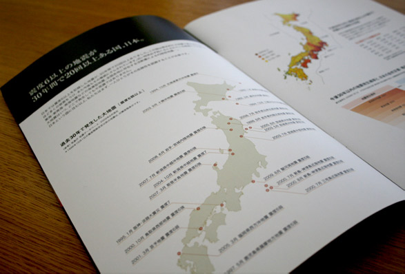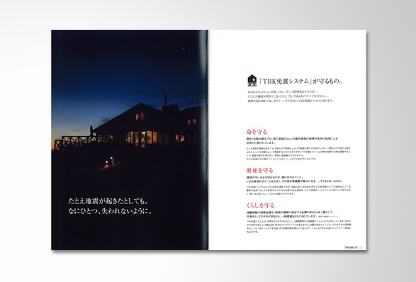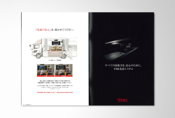 機械メーカー「THK」の製品である住宅用免震装置の免震システムコンセプトブックを作製。数冊に分かれていて複雑な内容の免震パンフレットを1冊にまとめ、新たに製品や工場の写真を撮りおろし、お客により解りやすい内容に新たにデザインした。