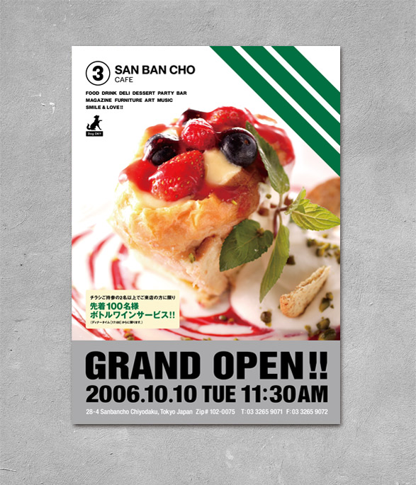 ロイヤルグループの新業態開発。外苑いちょう並木にあるロイヤルガーデンカフェ。プロジェクトコンセプトから導き出される、コミュニケーションデザイン全般を担当。仮囲いを使ったオープン告知プロモーションから、ロゴ、アプロケーションツール(ノベルティー、ショップカードなど)、メニューやユニフォーム、プロモーションなどのデザインを手掛けた。