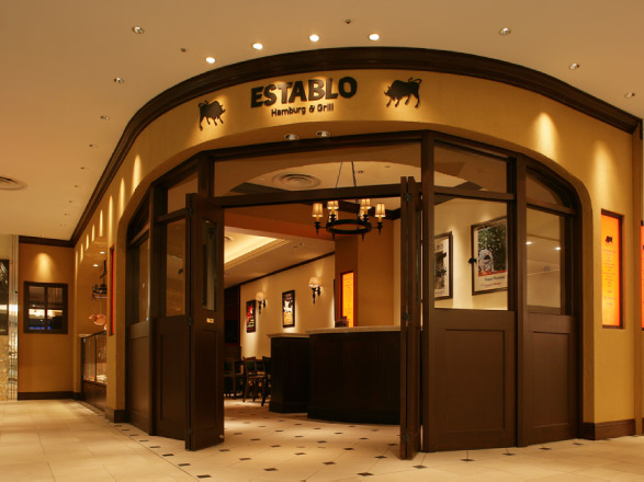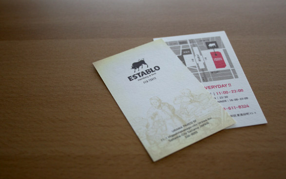 スペイングリルと炭火焼のハンバーグが楽しめるレストラン「エスタブロ」のロゴ、メニューブック、ショップカード、リーフレットのデザインを作製。店舗デザインに併せて経年劣化したような雰囲気のグラフィックとした。