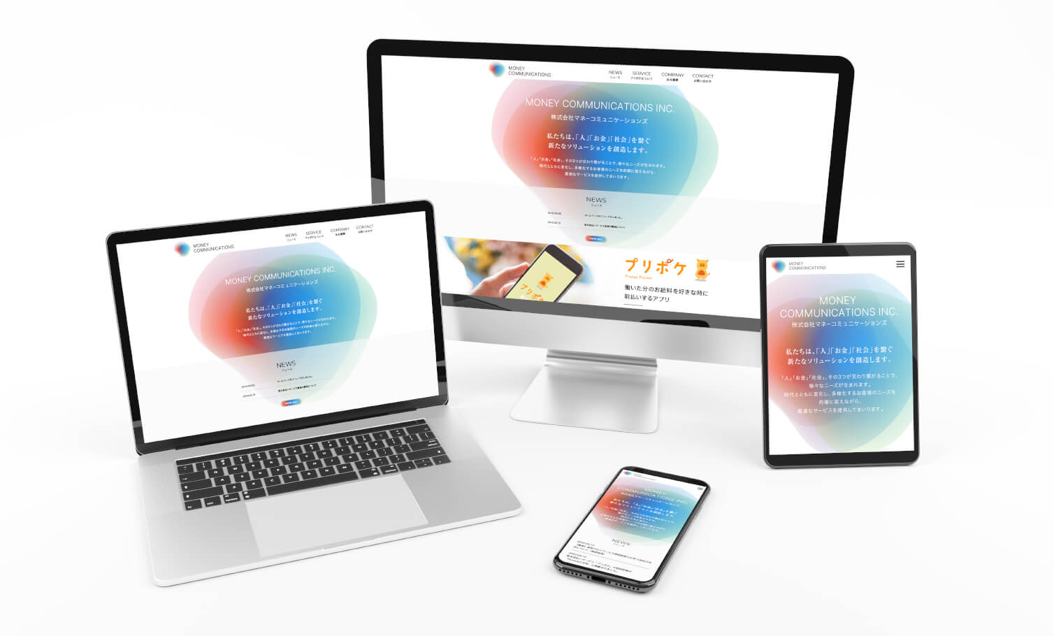 給与前払いサービス「プリポケ(prepay pocket)」を運営しているマネーコミュニケーションズのロゴの開発、Webデザイン、コミュニケーションツールの製作などを担当しました。